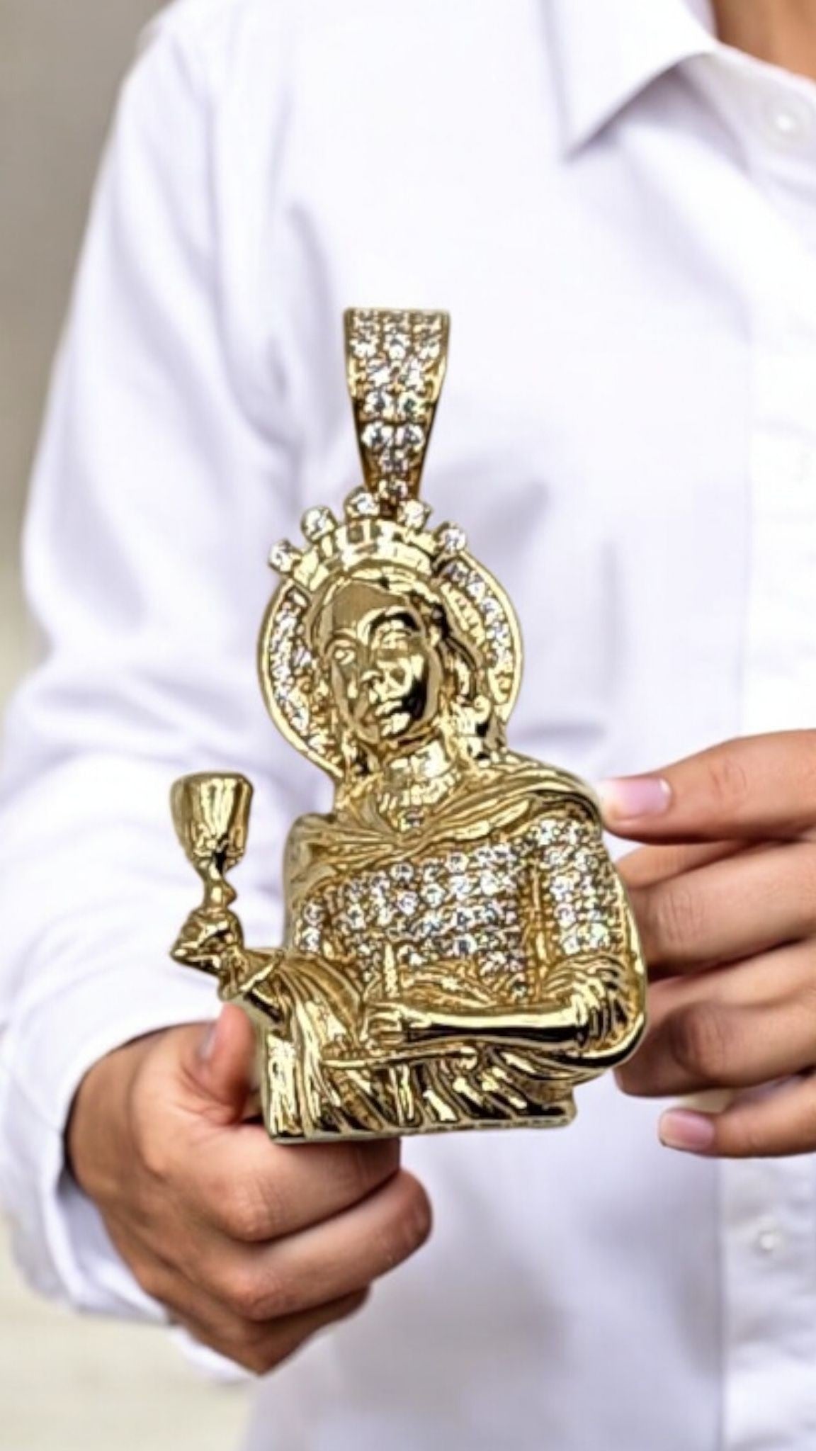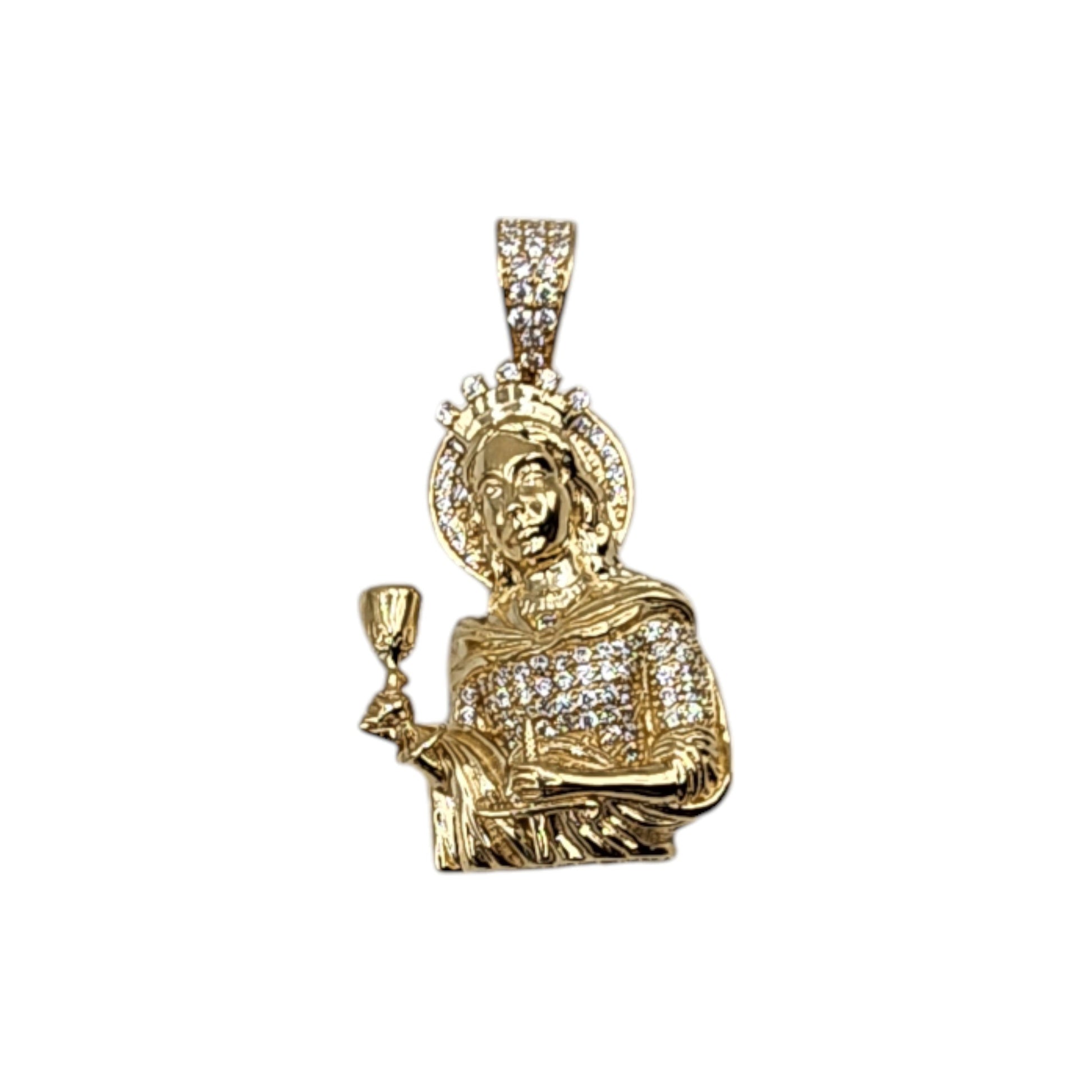 10KT Yellow Gold 40mm Semisolid 6.8g Santa Barbara W/ white & red Cz Pendant