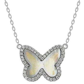 Silver Pendants Collection 18" Chain Mother of Pearl Butterfly W/ White Cz